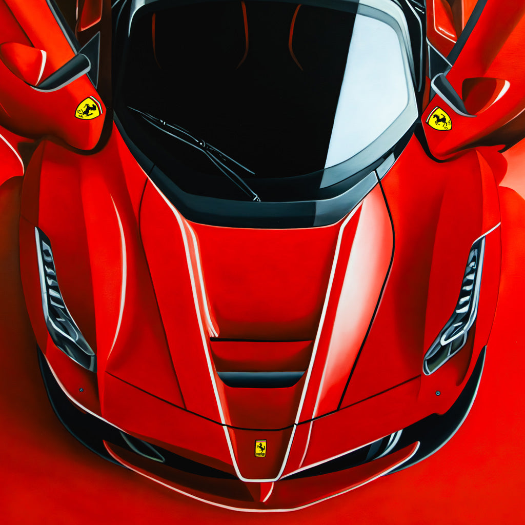A bold, top-down portrait of a red hypercar that feels more like art than machinery. The symmetry is sharp and intentional, with butterfly doors opened wide like wings, giving it a powerful, almost predatory presence. The red-on-red background makes the car feel suspended in motion, while clean lines and subtle highlights emphasize precision, speed, and exclusivity.