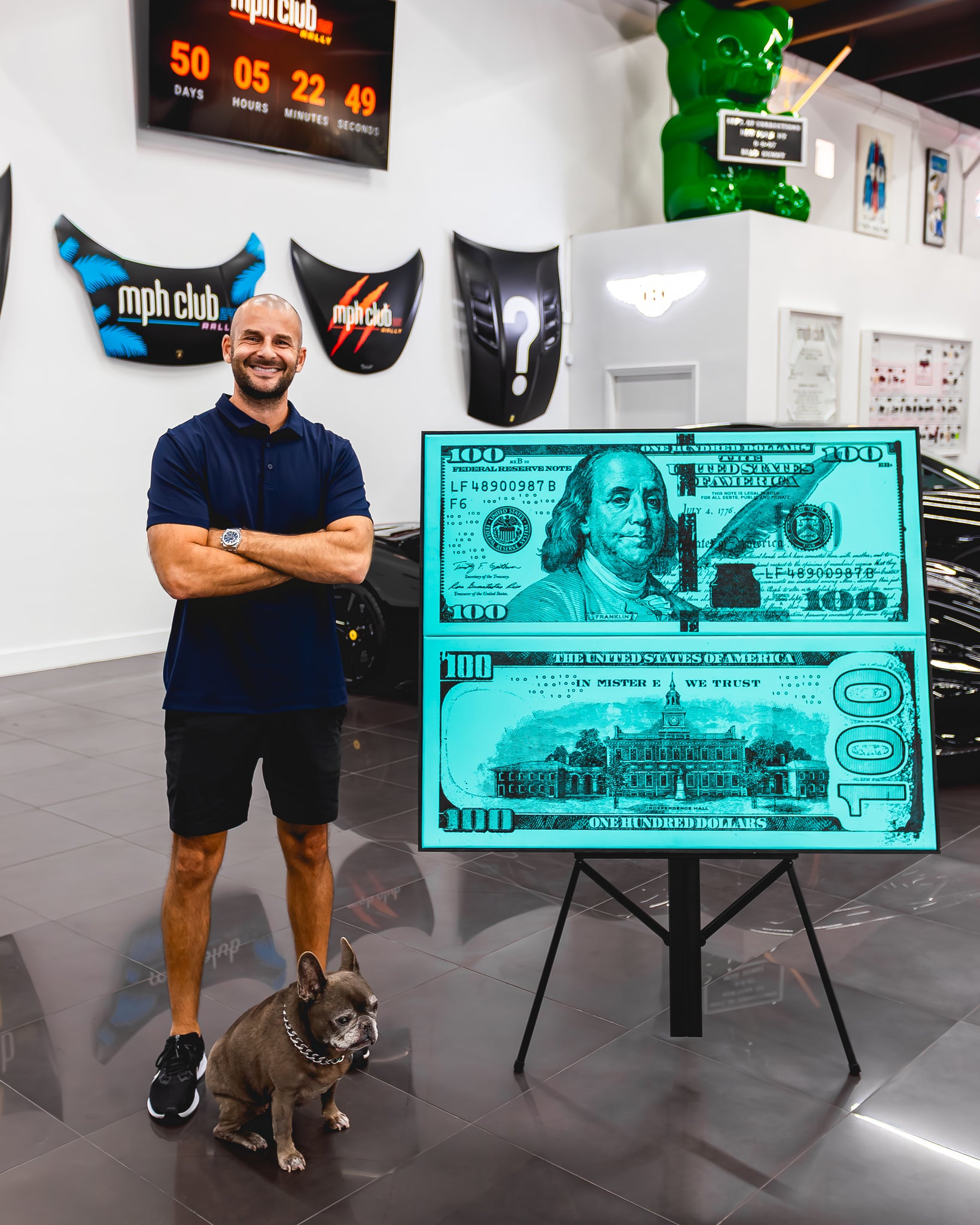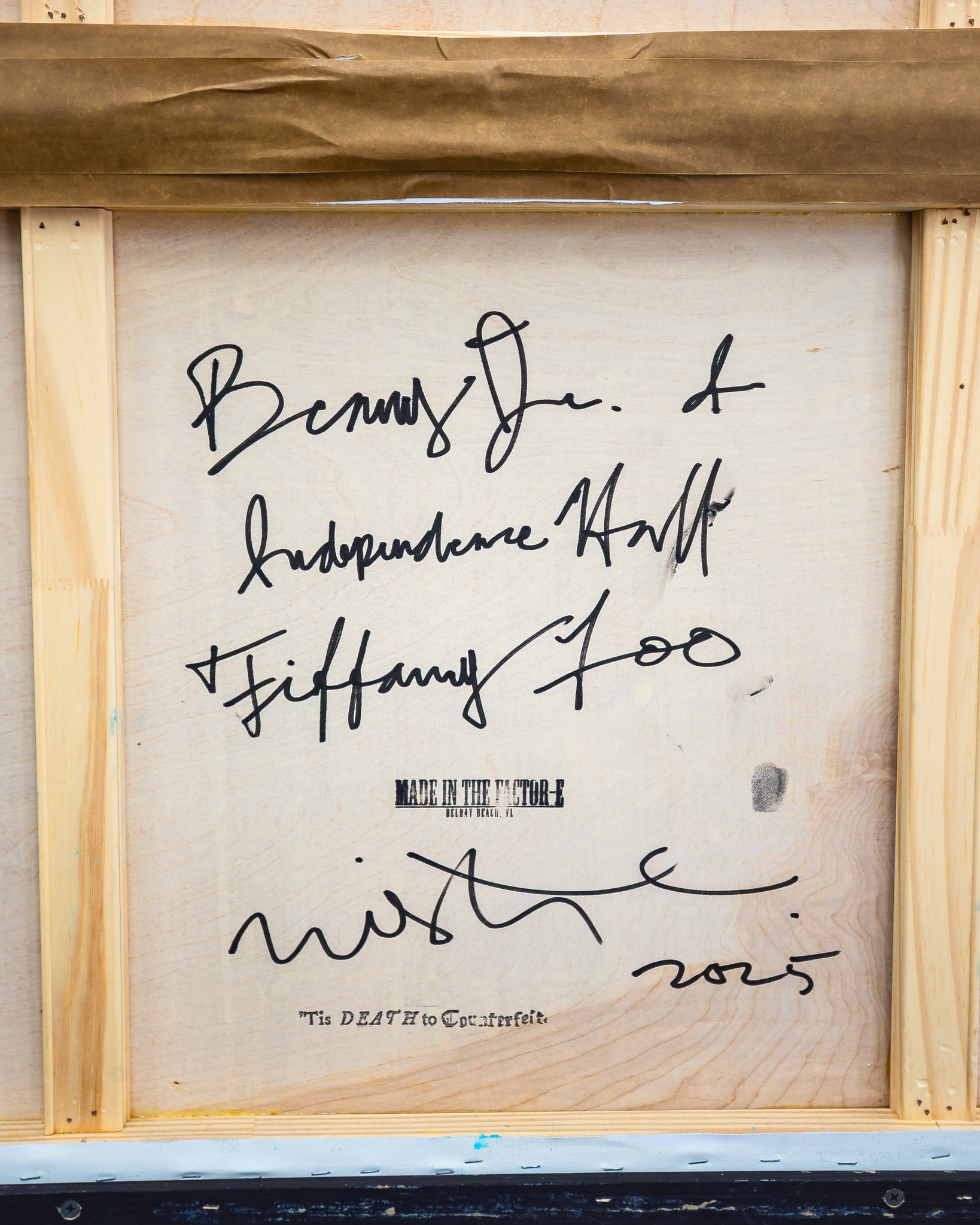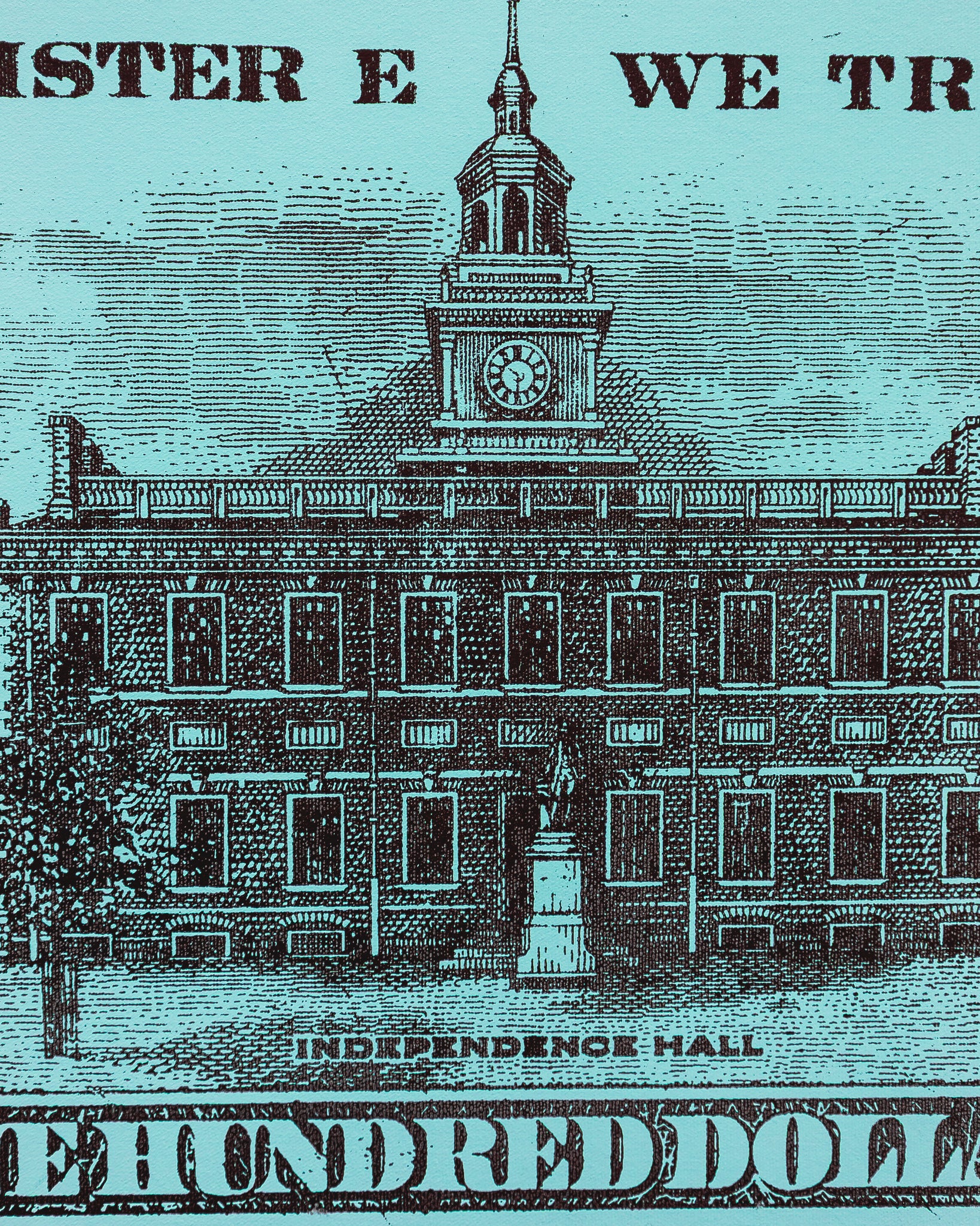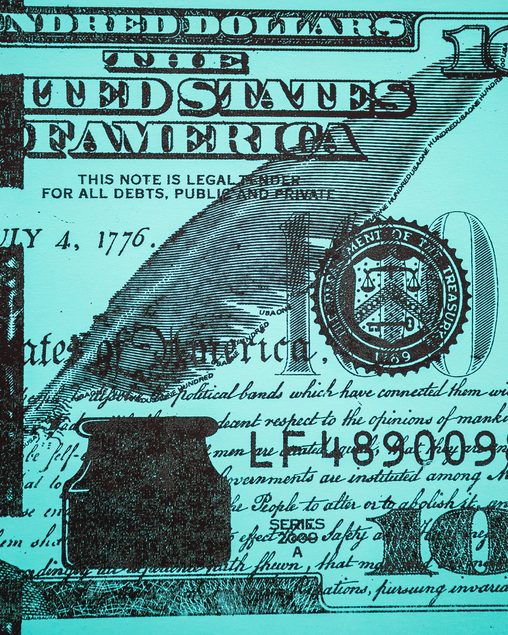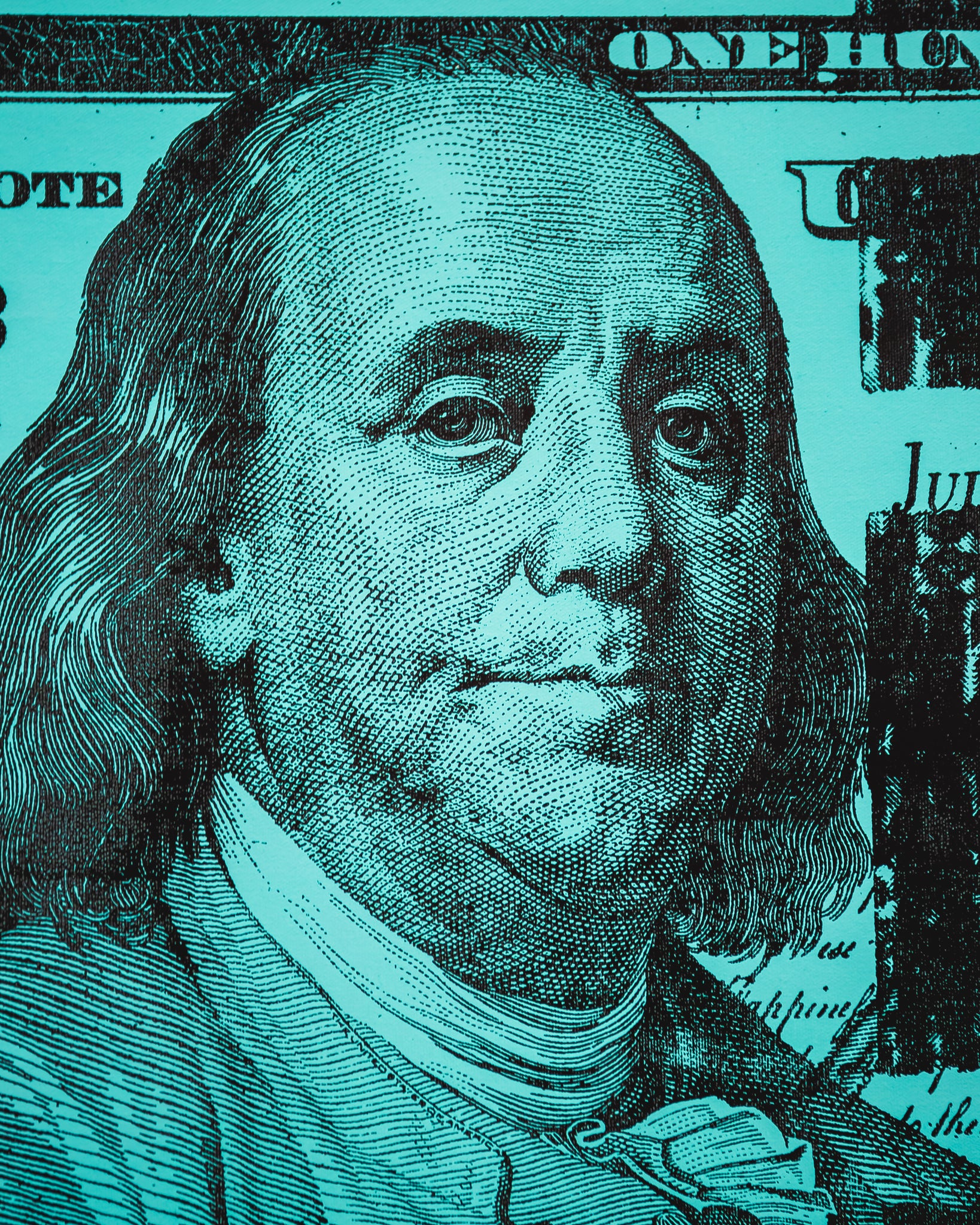 This striking piece reimagines the iconic $100 bill in a vivid cyan palette, transforming a universal symbol of value into a bold statement of modern pop art. By amplifying Benjamin Franklin’s portrait and architectural detail with saturated color, the work explores the intersection of culture, currency, and art as status. Both playful and provocative, it reframes money not as a transaction, but as an object of aesthetic power.