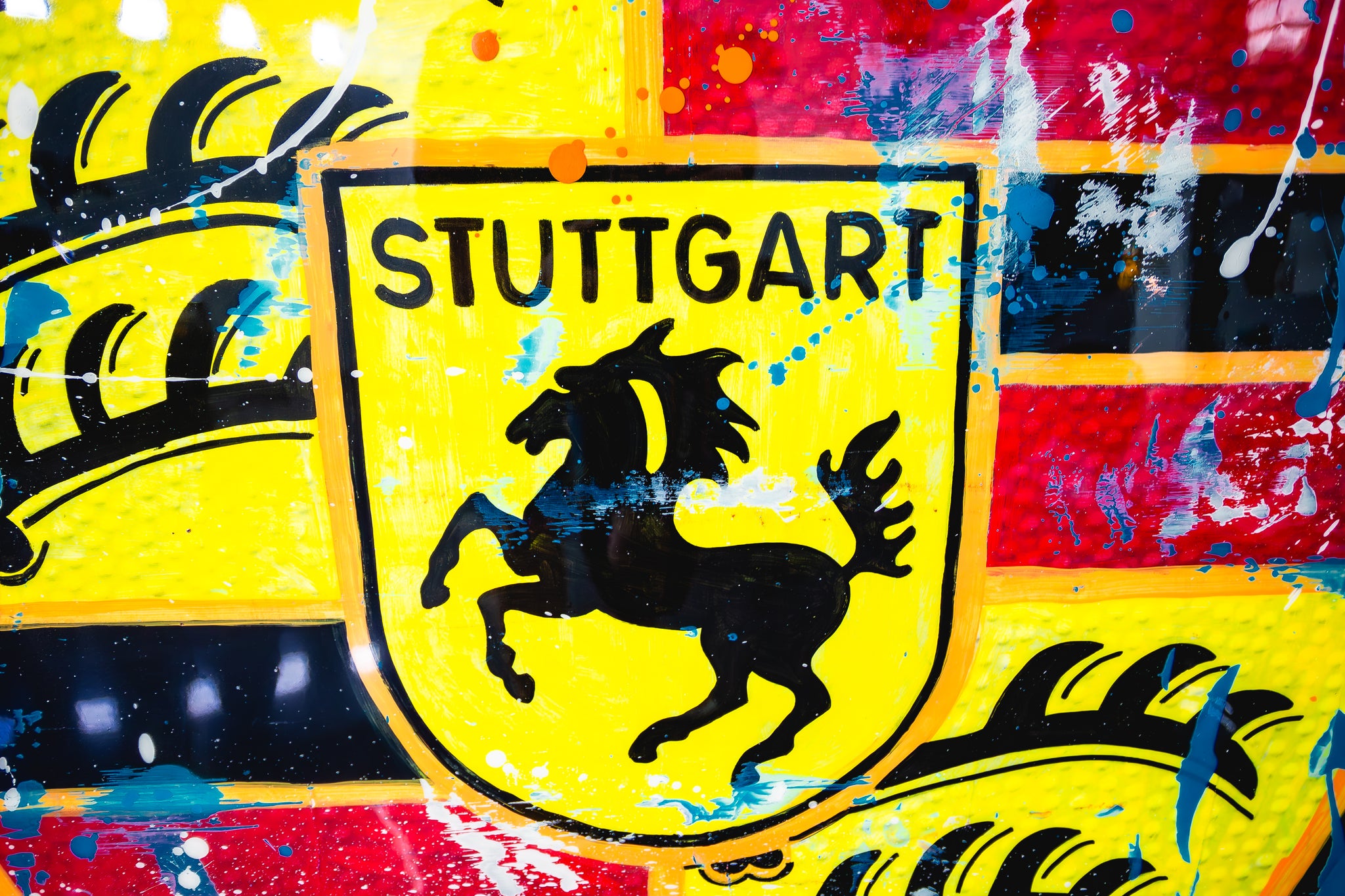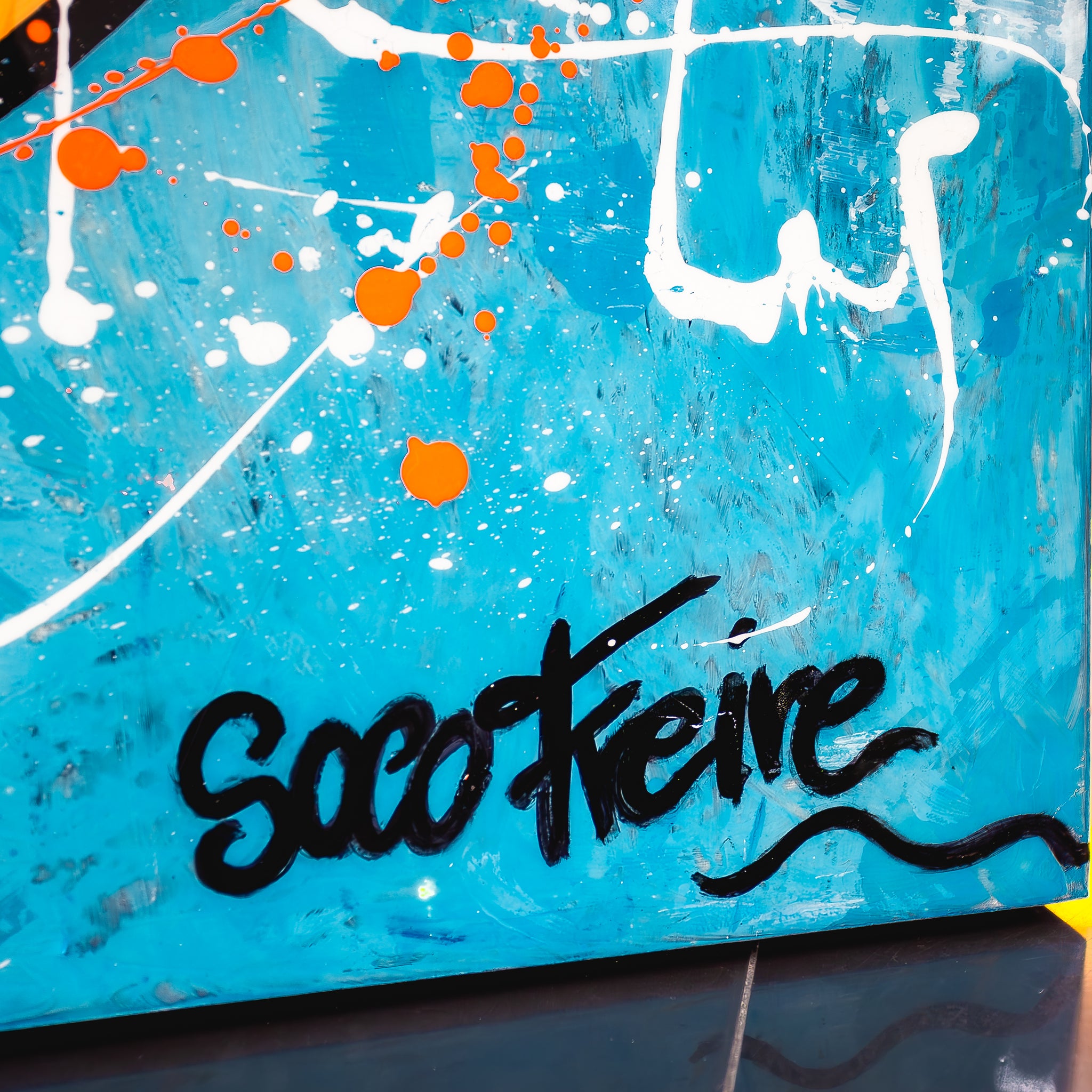 This piece by Soco Freire takes the classic Sports Car Logo Artwork crest and pulls it into something wilder. The sharp lines and symmetry are still there, but they’re surrounded by color blocks, paint splatters, and unexpected textures. Orange, turquoise, black—each part feels like it’s moving. It’s messy in the best way. The resin finish adds contrast and shine, catching the light and exaggerating the tension between order and instinct. It’s about tradition, but it’s also breaking from it.